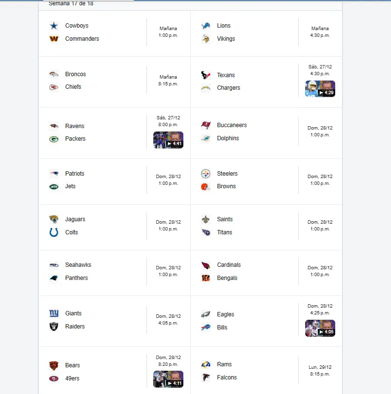 Juegos de la NFL del 24 – 29 de diciembre 2025