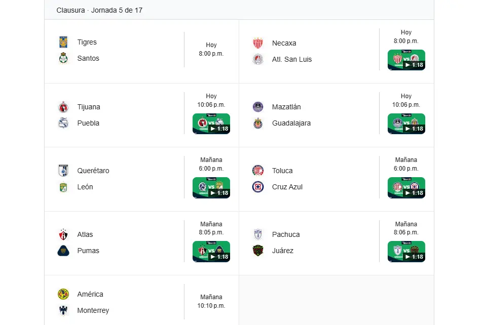 Esta es la informacion de la jornada 5 de la liga MX donde hoy viernes inicia con 4 encuentros y el resto para el dia sábado.